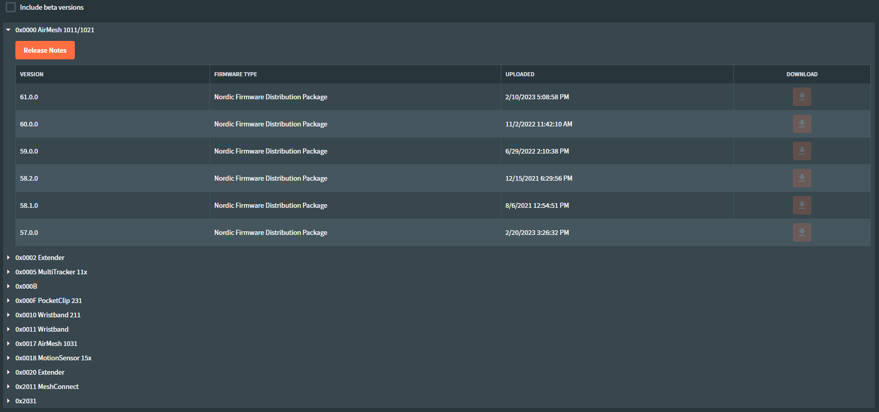 In Firmware section there are official and beta versions for the devices available for download and further use. Gateways will fetch firmware automatically if needed when device upgrade jobs are started.