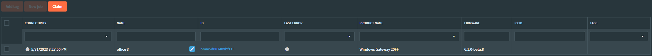 Claim can be used by a customer to claim a gateway if it's not yet assigned. If a gateway is already assigned, claiming will result in an error. Claiming can be done using ID (gateway ID, typically BLE MAC address of adapter) or SN (serial number of host machine). MeshConnect2011 gateway ID should always start with "bmac-", for example "bmac-aabbccddeeff". Gateways using USB BLE adapter use only BLE MAC as ID, for example "aabbccddeeff".
