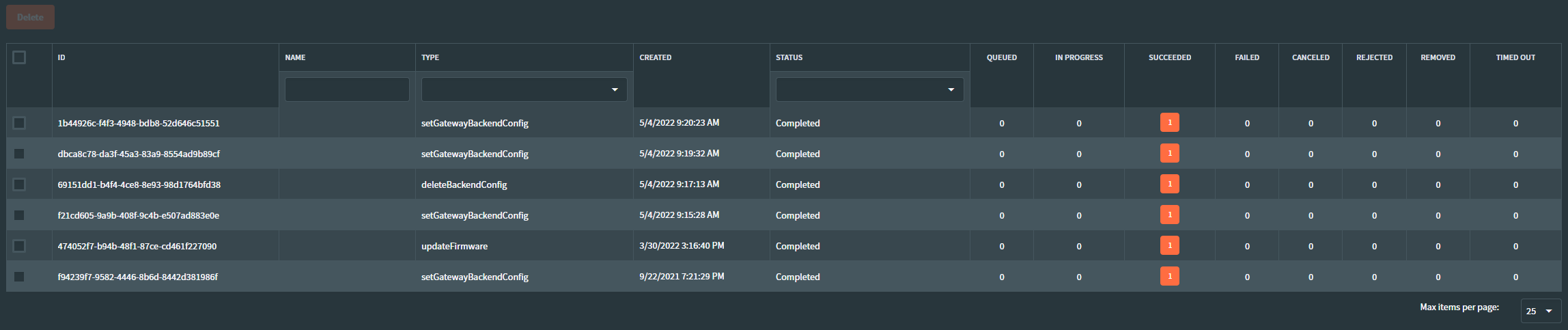 The job has appeared in the list with a Job type setGatewayBackendConfig, a date when created, a Job status COMPLETED and 1 device in DEVICES SUCCEEDED column.