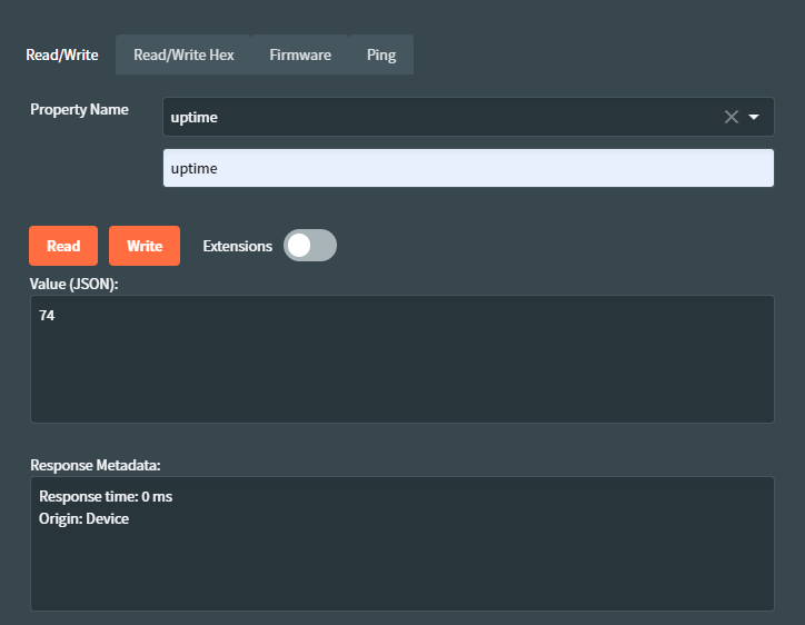 It is possible to read/write properties in decoded and hex modes. In a menu next to the device's MAC, select a property in a drop-down menu Interact.
